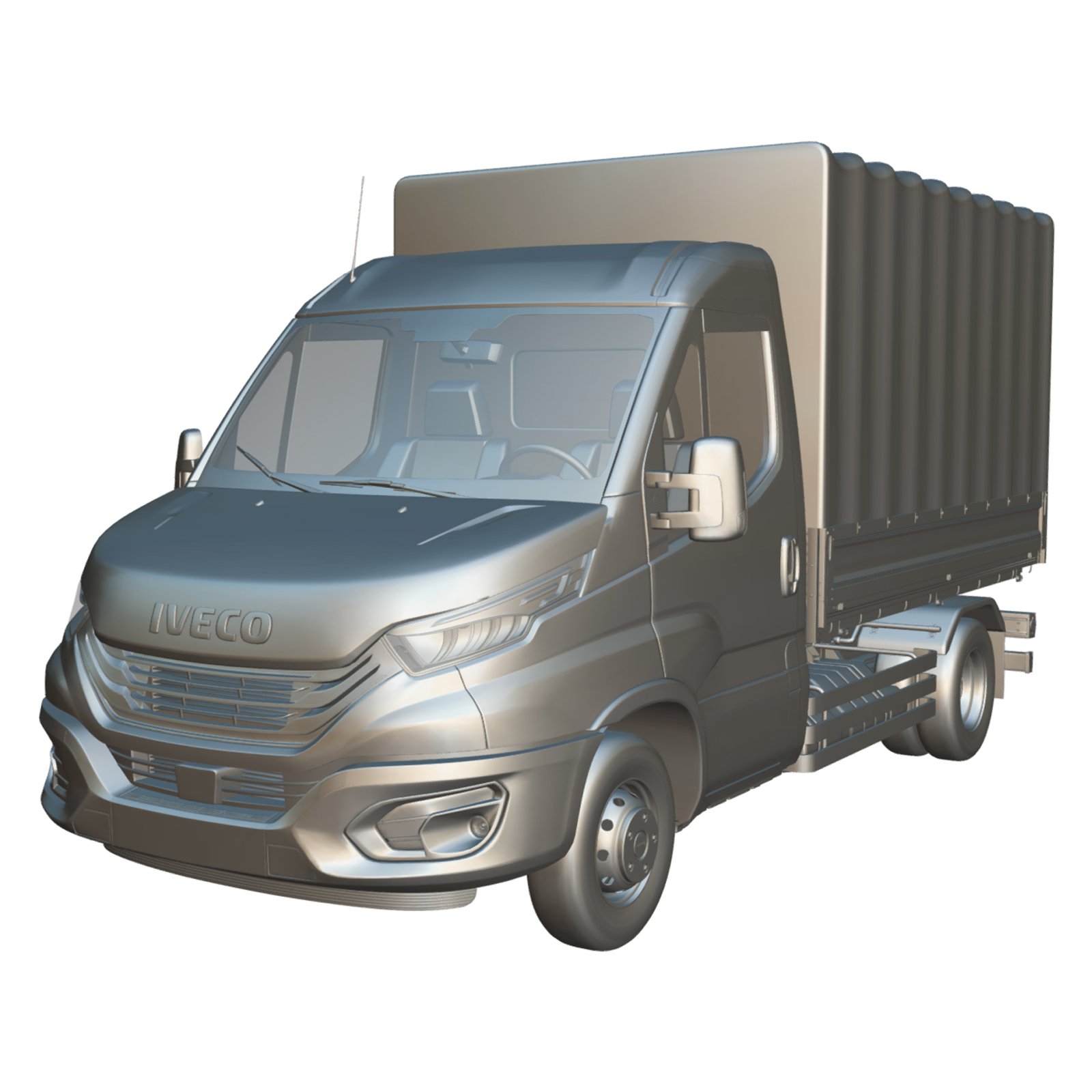 A high-quality Iveco Daily 2022 Short Canvas Flatbed 3D model featuring detailed exterior design with a canvas-covered cargo platform and a basic interior cabin. Built with clean topology and organized geometry for easy customization and integration into rendering, animation, simulation, and game development pipelines. Textures and UV maps are not included, allowing flexible custom material workflows.