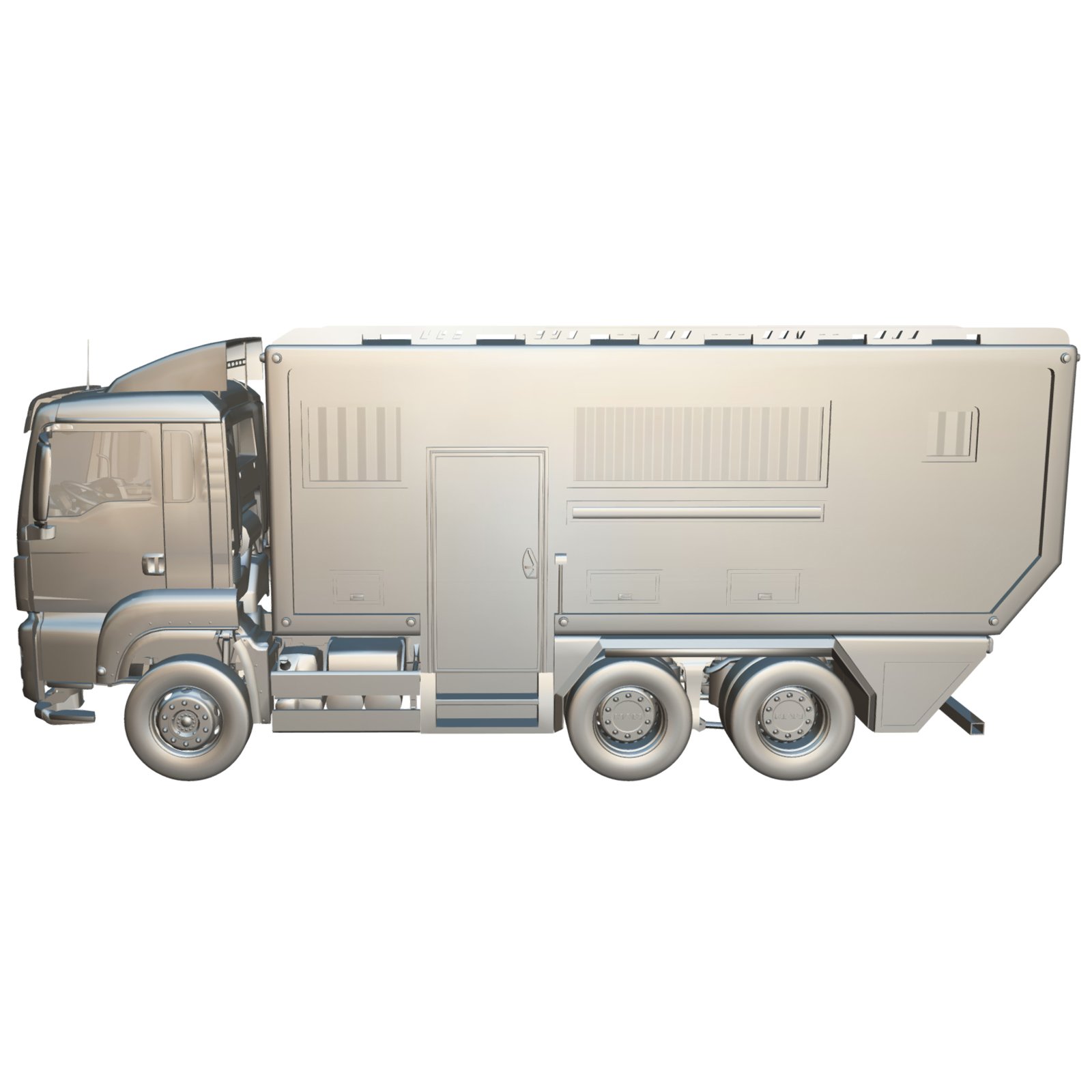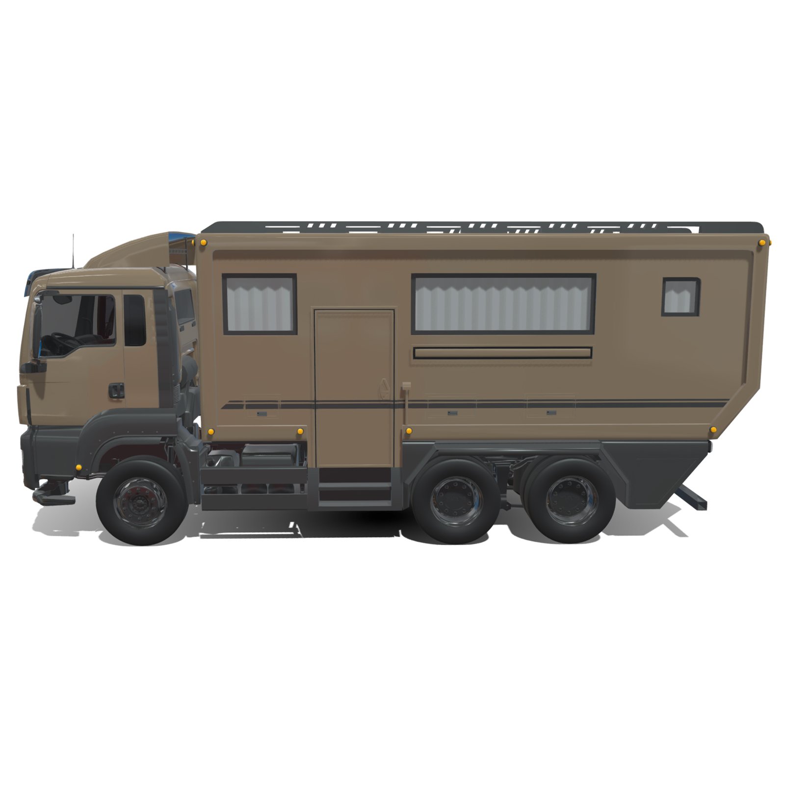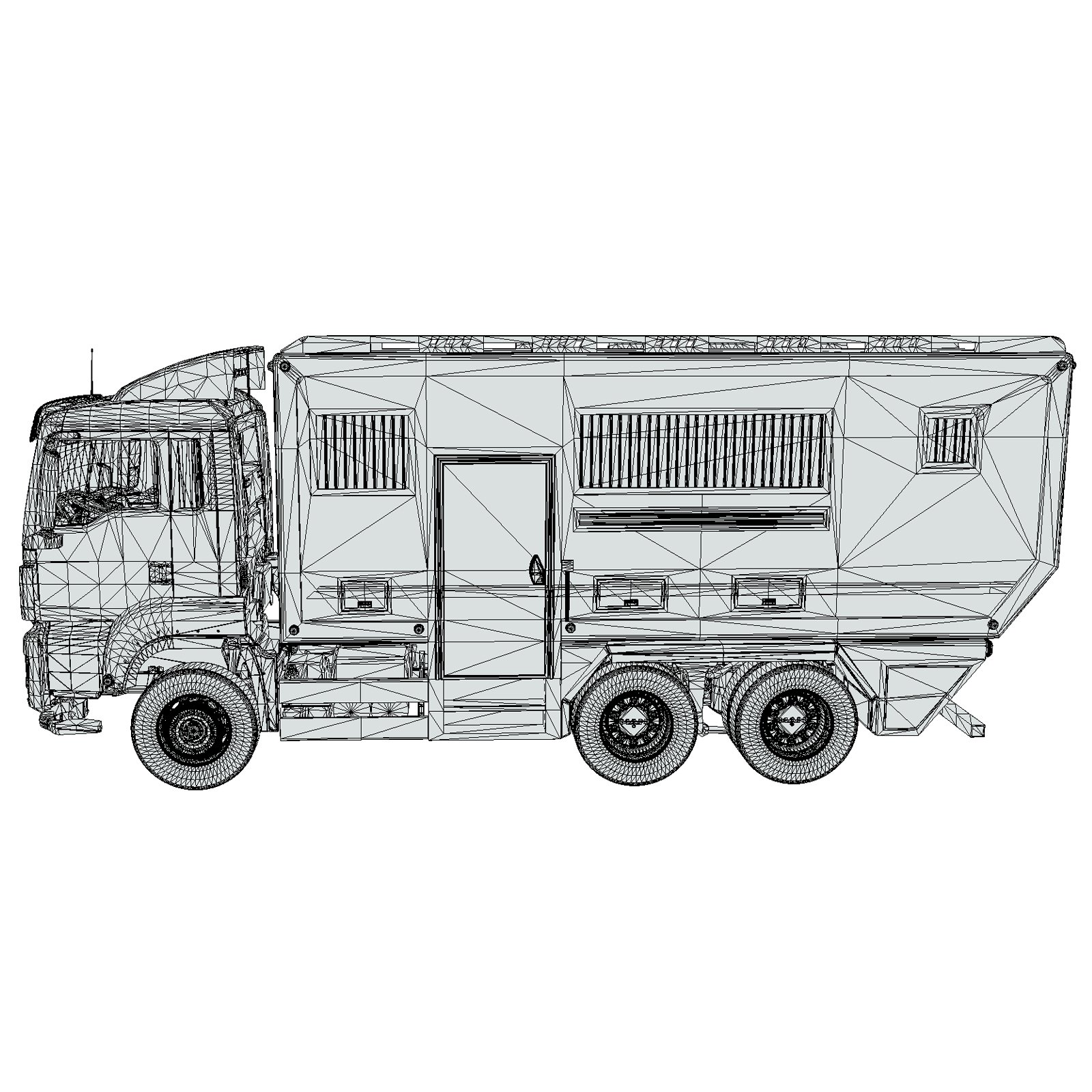 - Detailed Exterior Elements including cabin, windows, doors, rims, chassis, side compartments, roof details, and motorhome extensions.