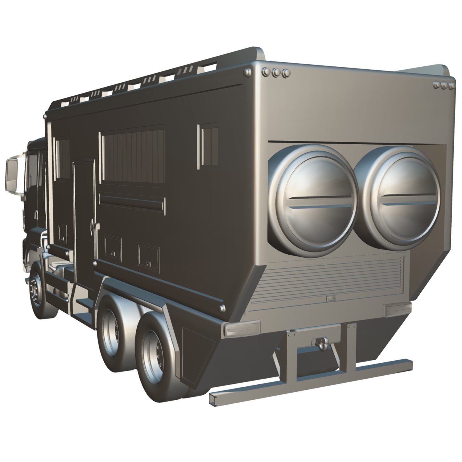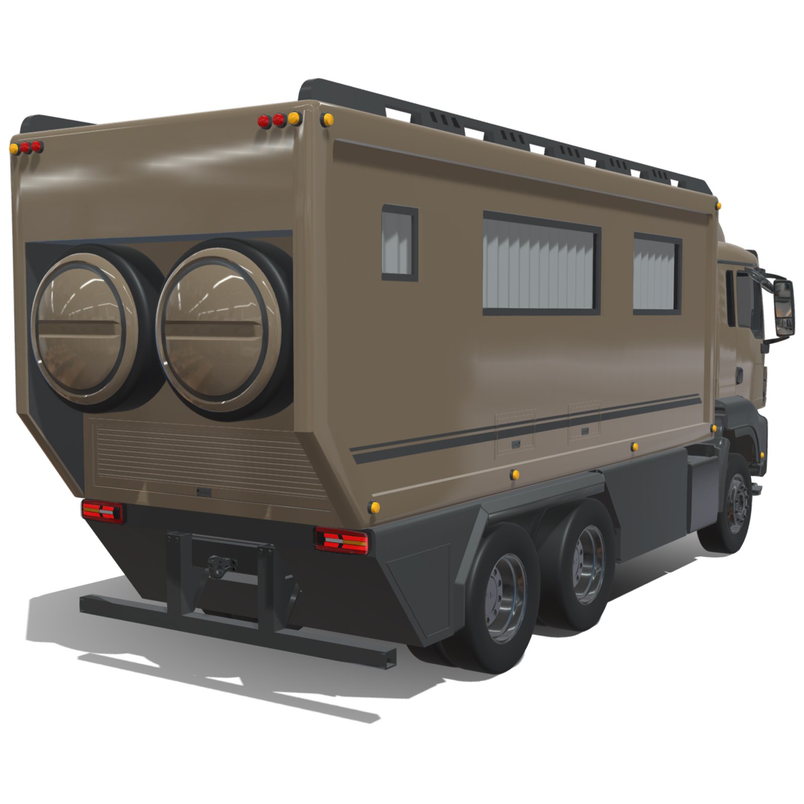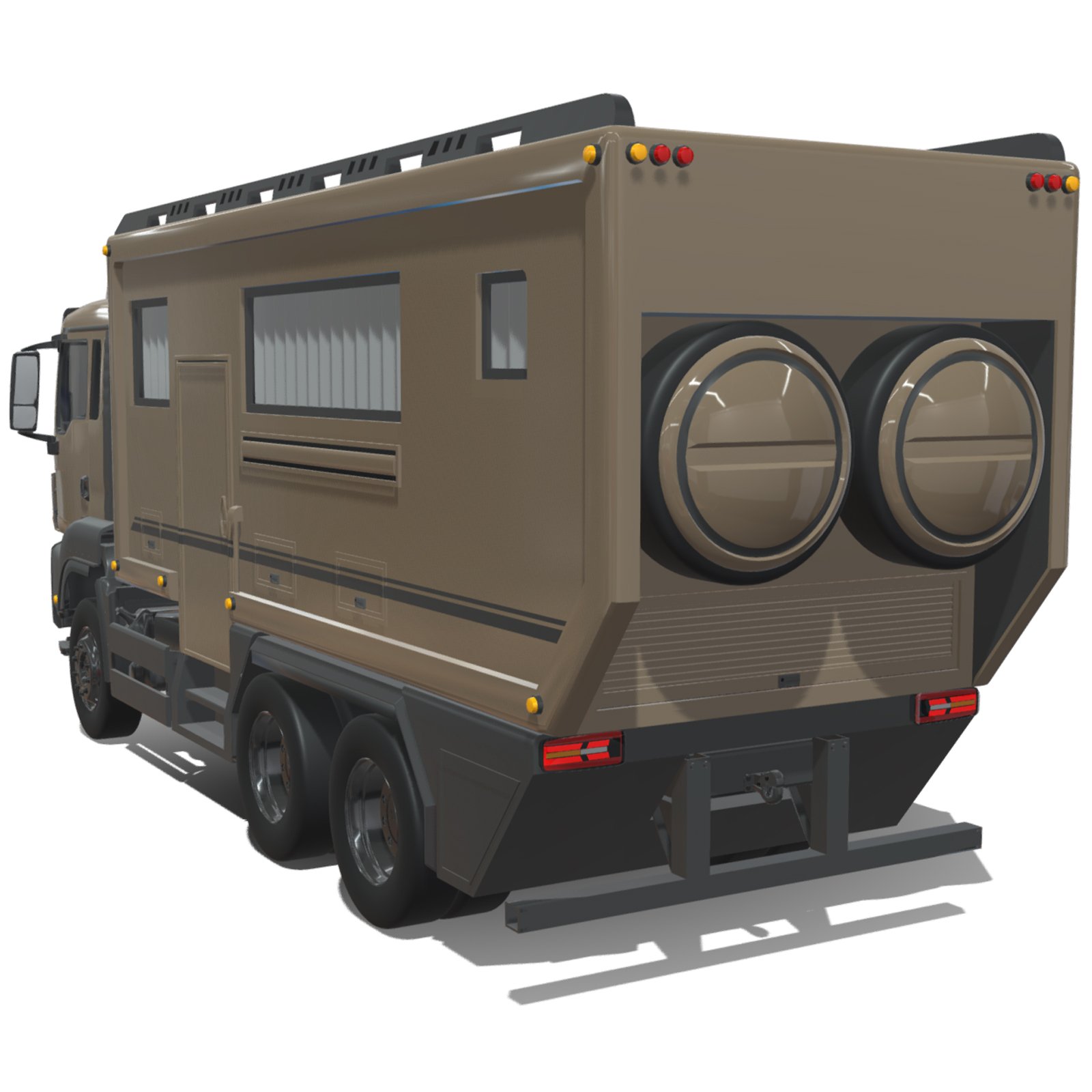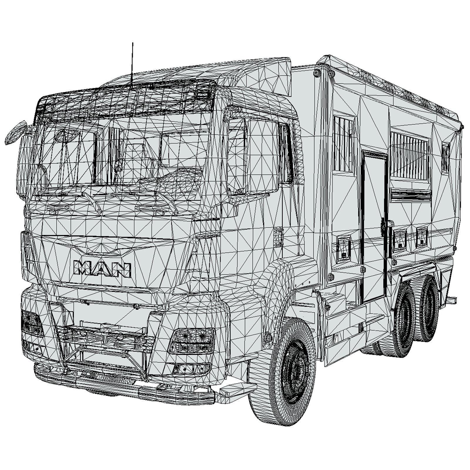 - Detailed Exterior Elements including cabin, windows, doors, rims, chassis, side compartments, roof details, and motorhome extensions.