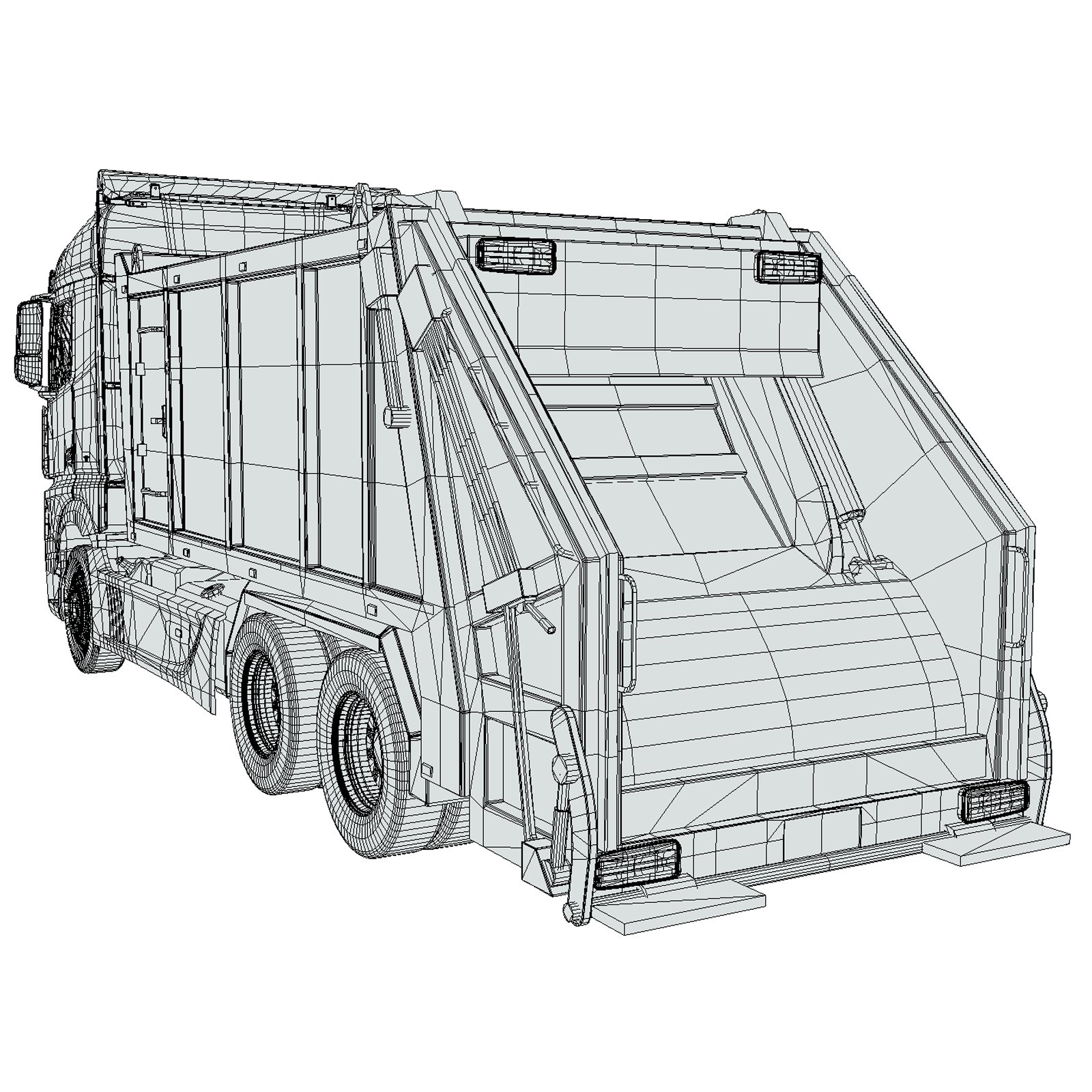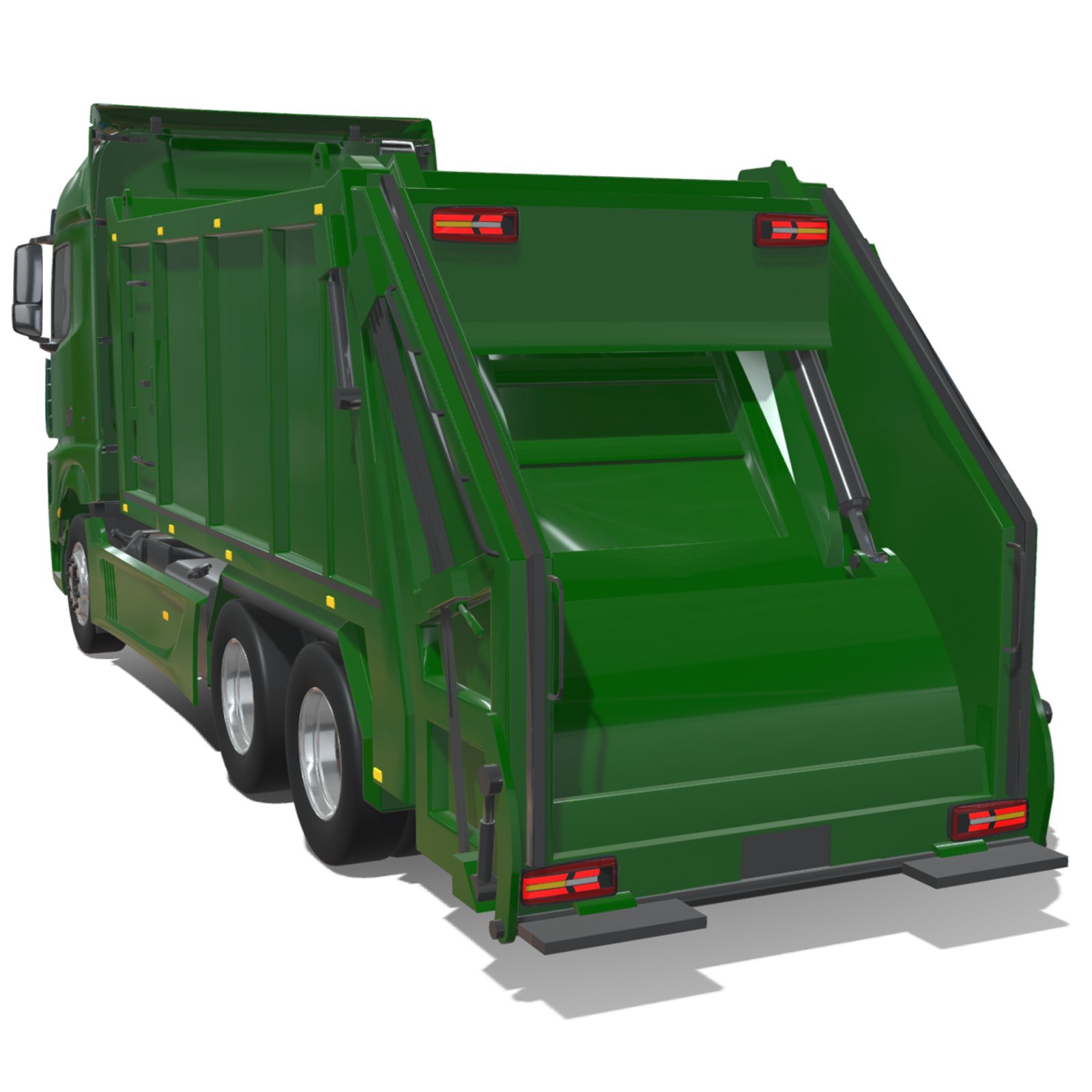 - Detailed Components: Includes cab, chassis, wheels, and garbage container.