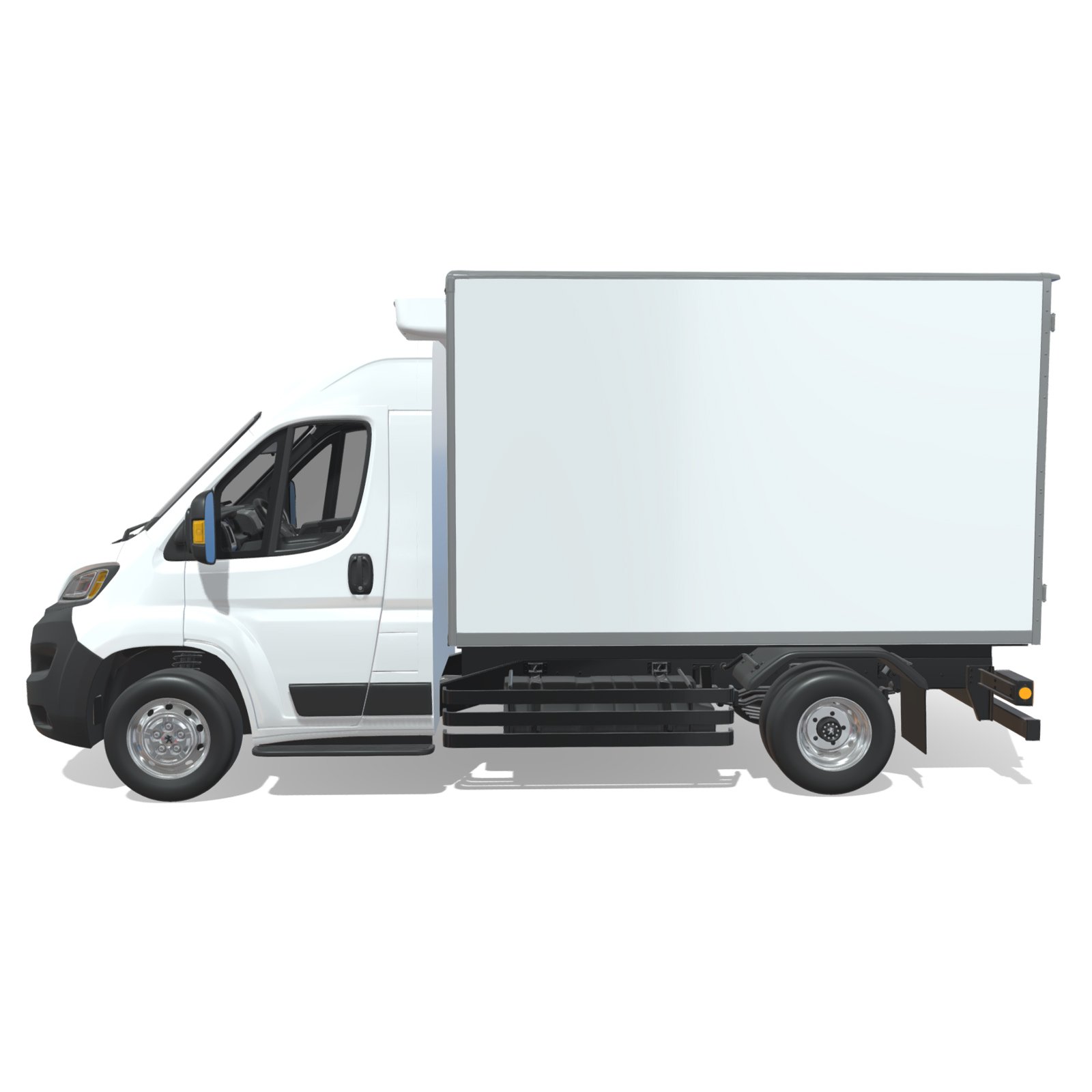 The model includes a high-quality exterior, featuring the insulated refrigerated cargo box, vehicle body structure, chassis components, and wheels. It also contains a fully modeled interior cabin, including dashboard elements, steering wheel, driver and passenger seats, and other essential interior details to provide a realistic vehicle appearance in close-up scenes and renders.