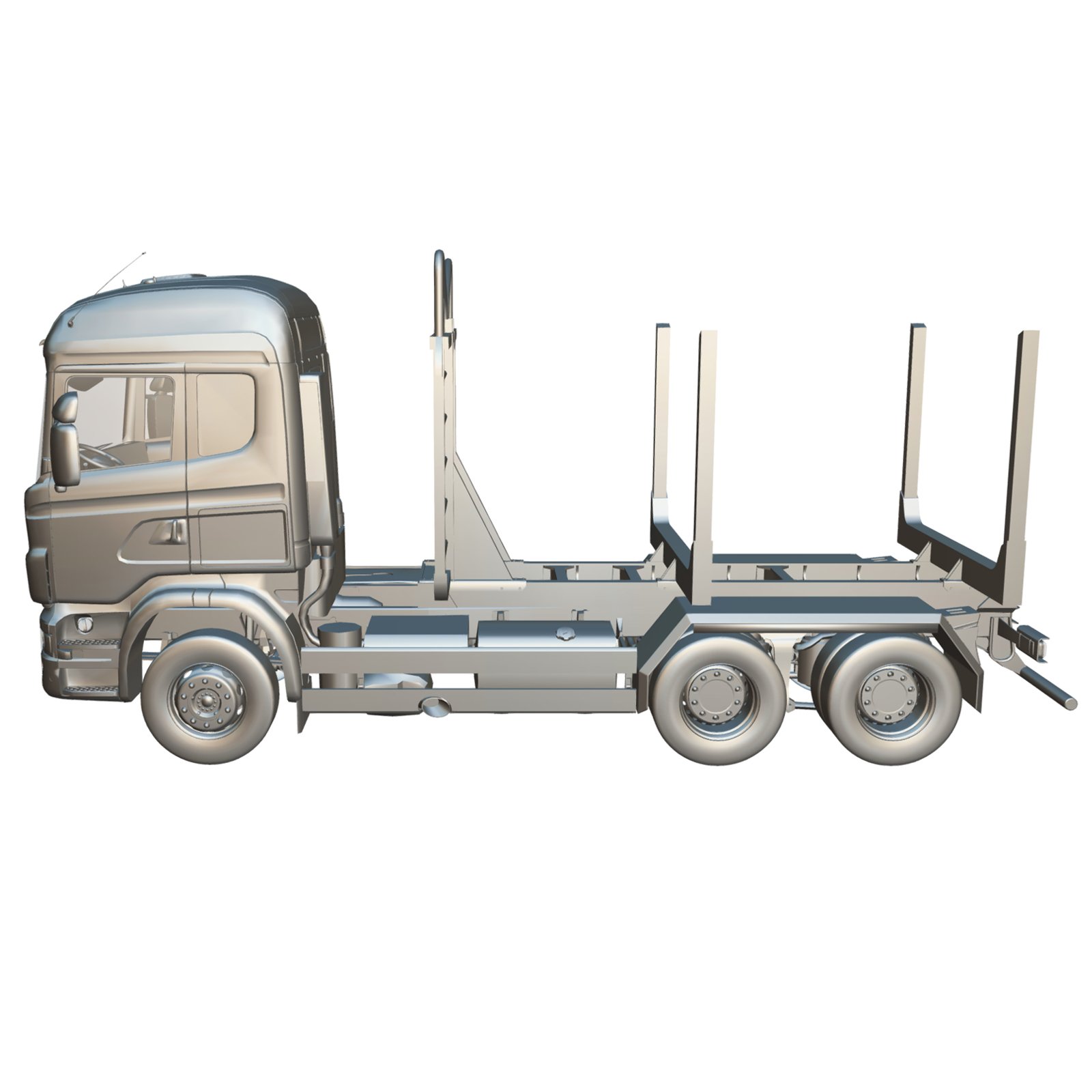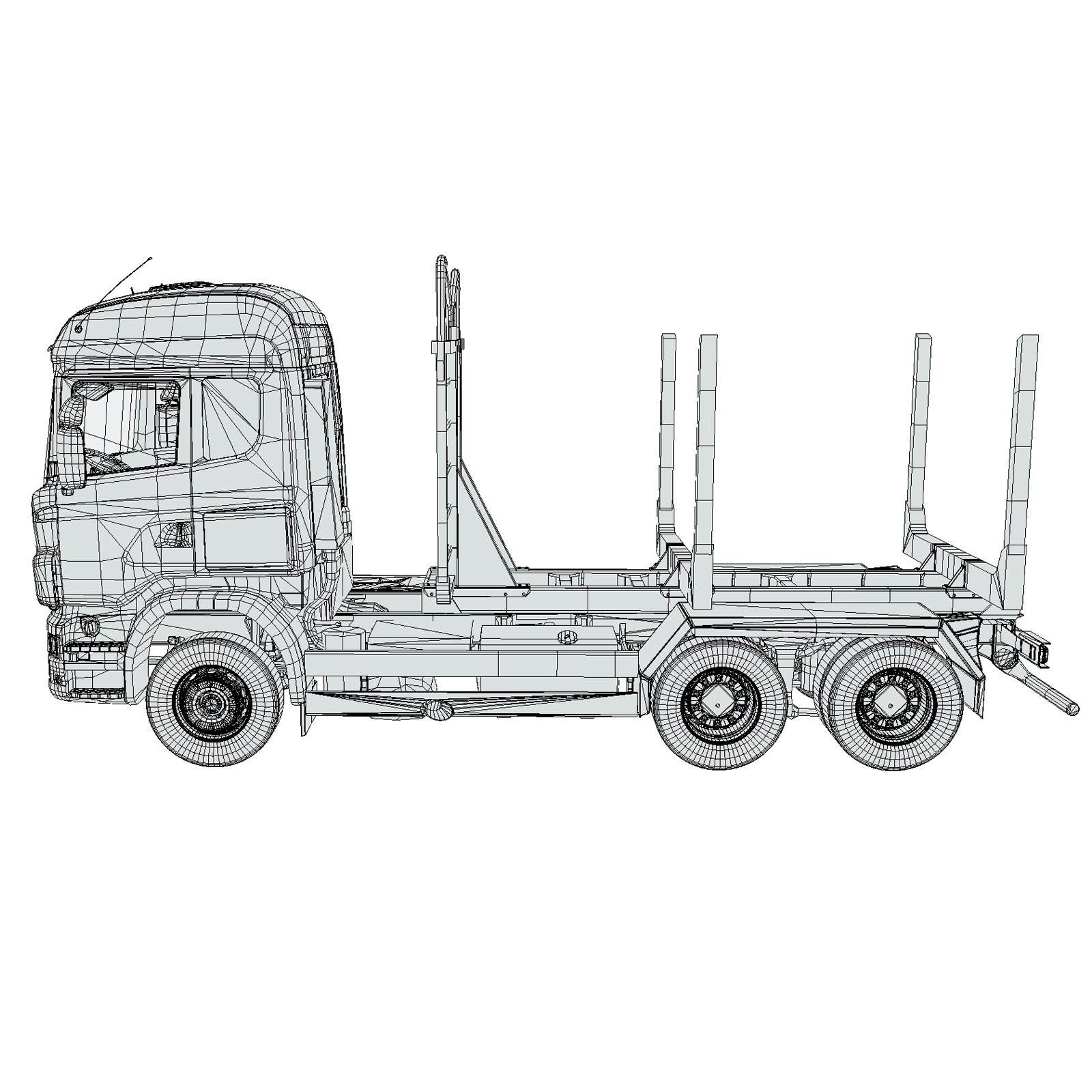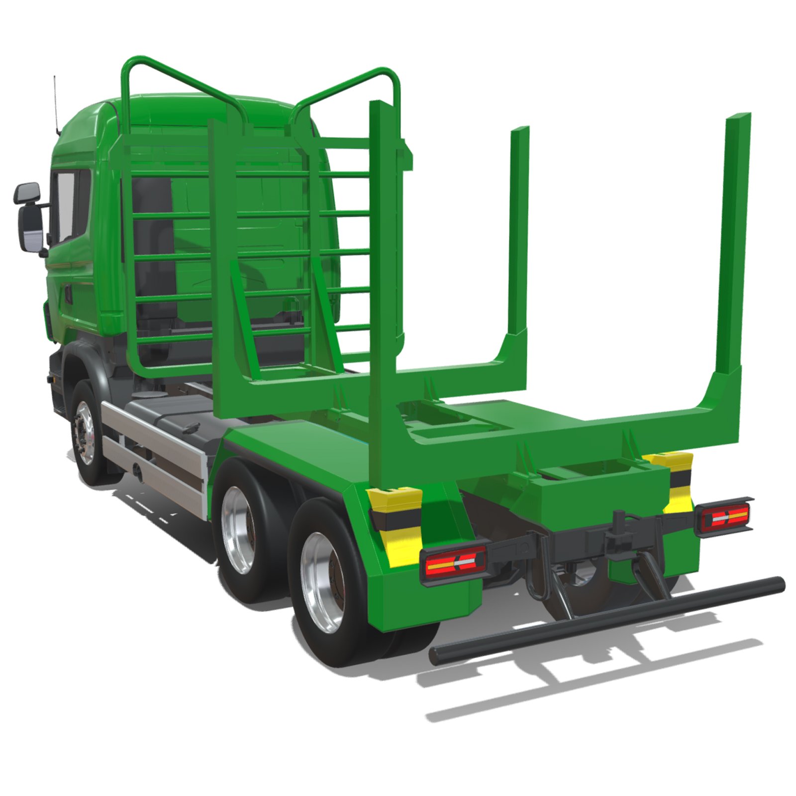 A realistic Scania R490 2018 Logs Truck 3D Model created in 3ds Max, featuring clean low-poly geometry and a detailed log-carrier frame. Ideal for forestry scenes, cargo simulations, games, and industrial visualization. No textures included.