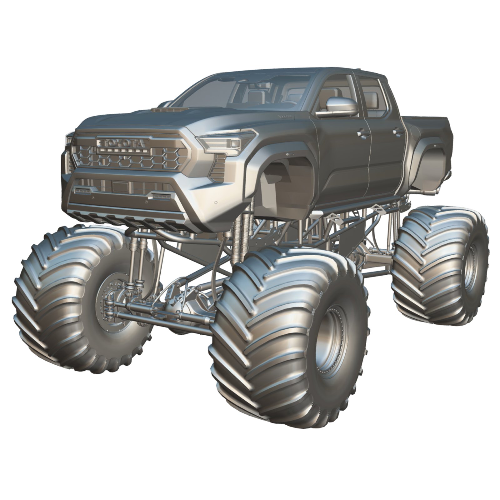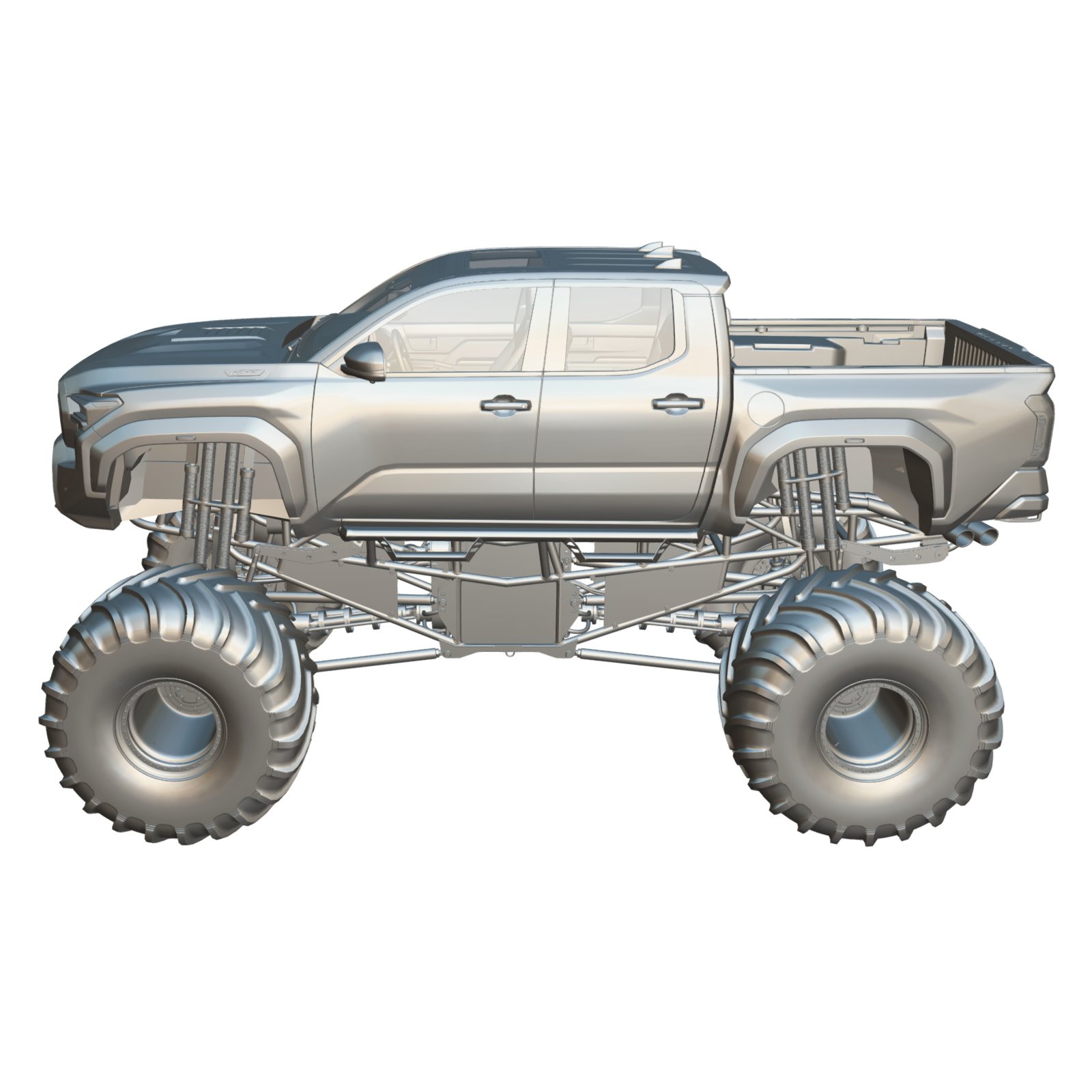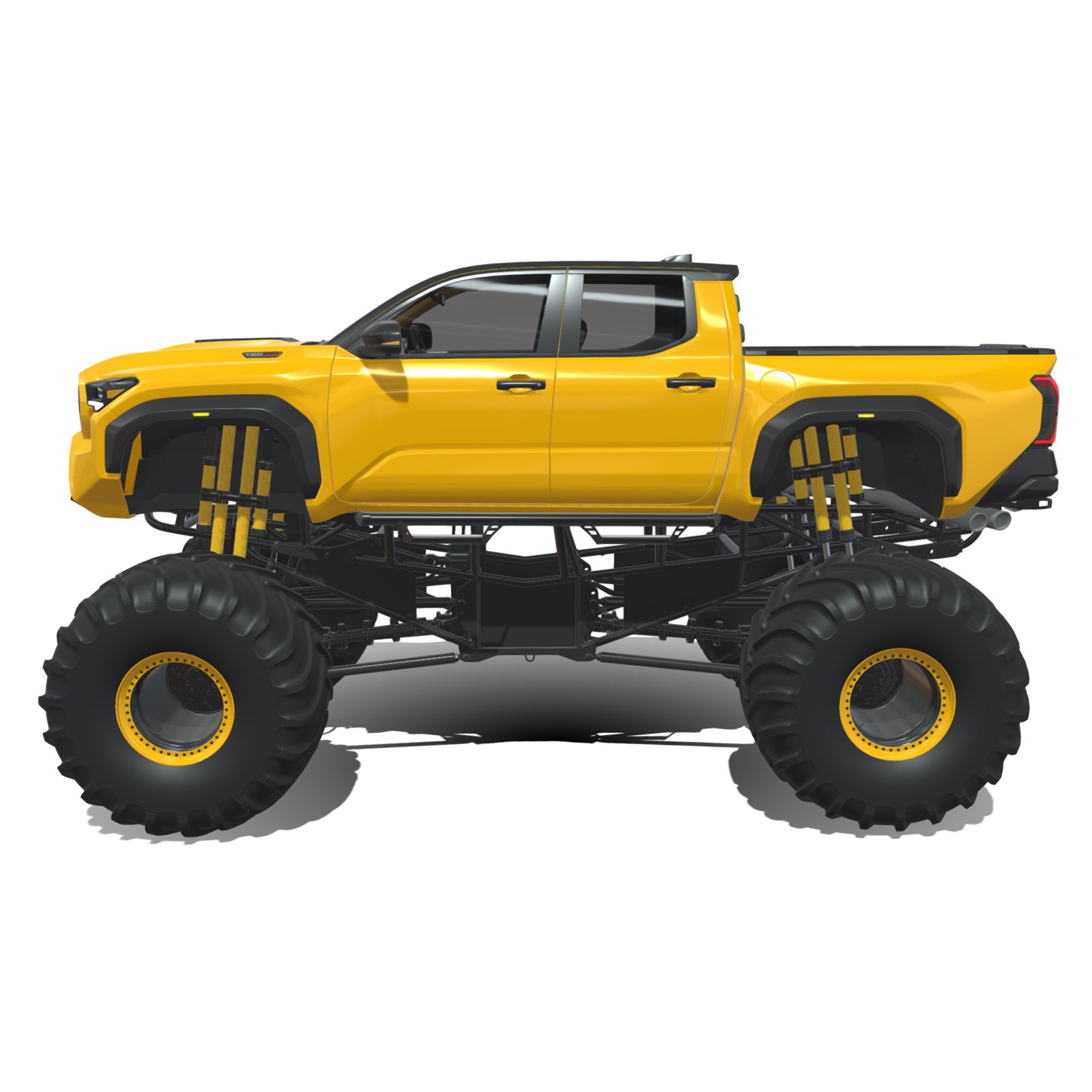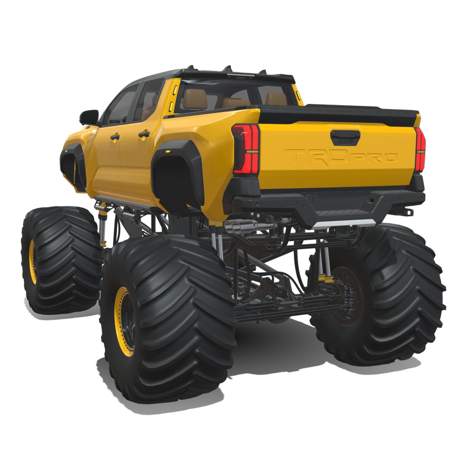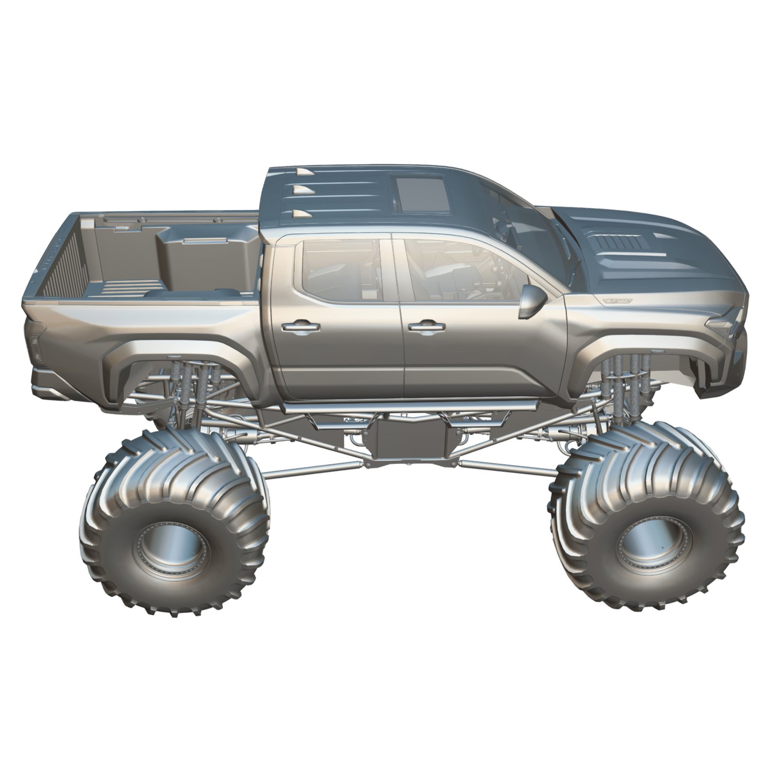 Take the legendary off-road capability of the Toyota Tacoma TRD Pro 2024 to an extreme new level with this Monster 3D Model. Built in 3ds Max 2021, this version reimagines the Tacoma with a full monster-truck upgrade — oversized tires, lifted heavy-duty suspension, reinforced body stance, and aggressive proportions.