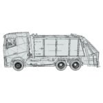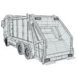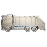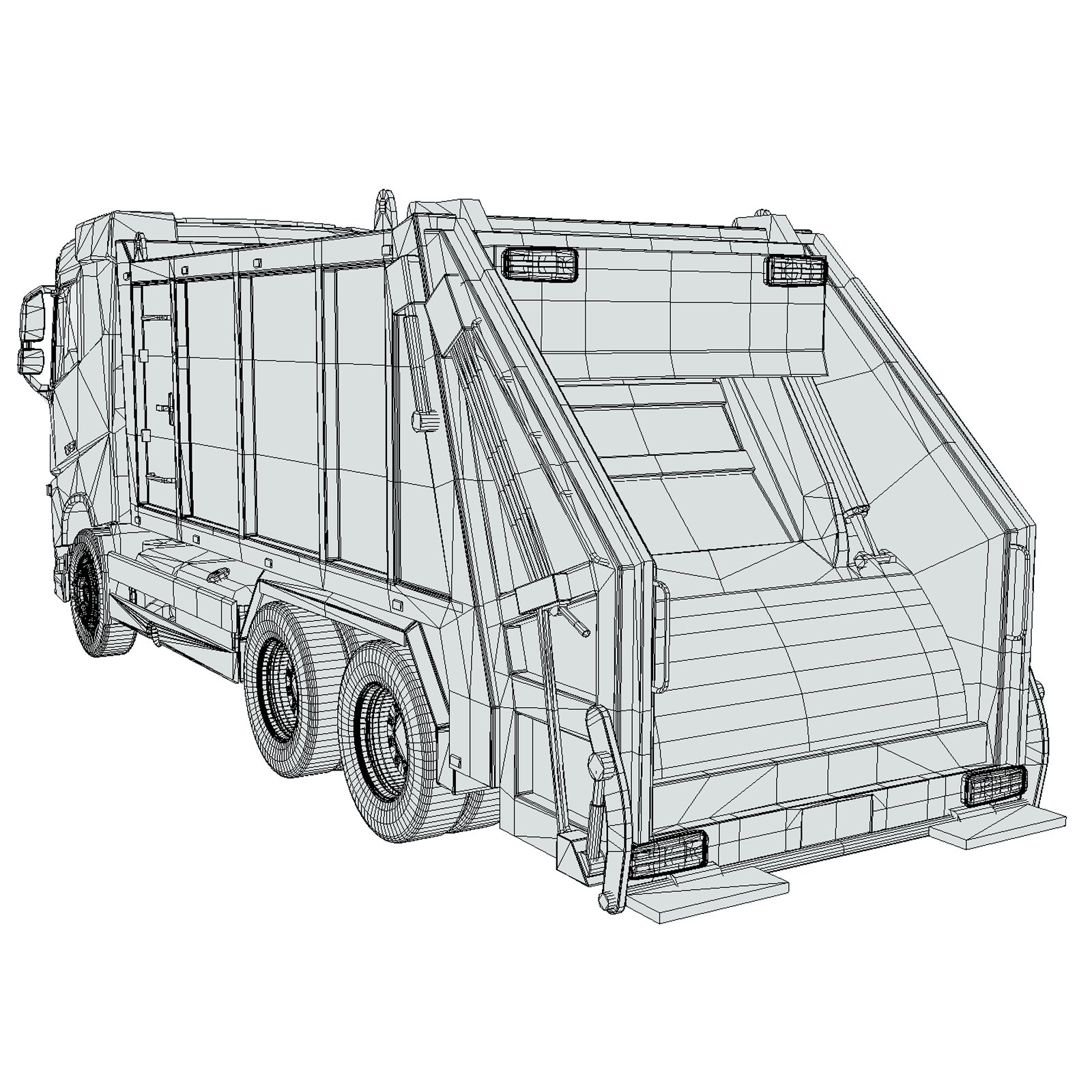 - Includes key elements such as cab exterior, wheels, chassis, garbage container, and lifting mechanisms.